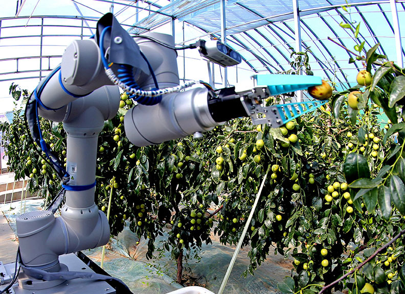 全国首台“蓝侠”冬枣采摘机器人在大荔县冬枣种植农场投入实验运作。