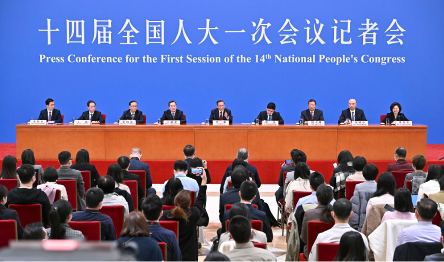 3月13日,十四届全国人大一次会议在北京人民大会堂举行记者会,国务院总理李强应大会发言人王超的邀请出席记者会,并回答中外记者提问。国务院副总理丁薛祥、何立峰、张国清、刘国中参加。新华社记者李鑫摄