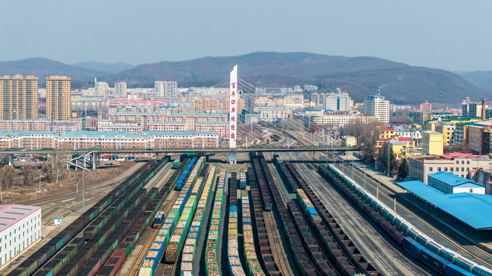 2025年4月10日,货物列车停靠在中国铁路哈尔滨局集团有限公司绥芬河站南场等待解体换装(无人机照片)。4月9日18时起,全国铁路实行新的货物列车运行图。新华社发(曲艺伟 摄)