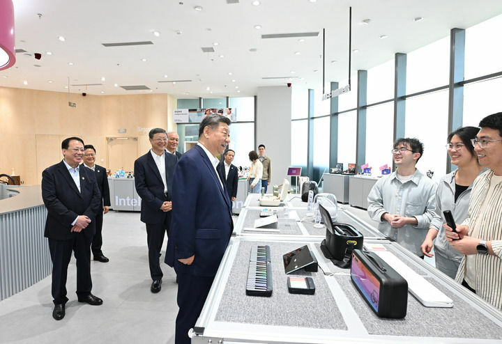 4月29日,中共中央总书记、国家主席、中央军委主席习近平在上海考察。这是习近平在位于徐汇区的上海“模速空间”大模型创新生态社区人工智能产品体验店考察。新华社记者 谢环驰 摄